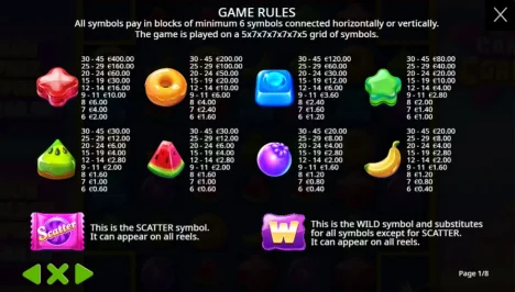 The 7×7 online slot game grid is set against a backdrop of a whimsical candy land. A gingerbread house, towering lollipops, and a sky full of cotton candy clouds create a truly magical atmosphere. Every spin is a visual delight, with colourful symbols and animations that bring the candy-coated world to life.