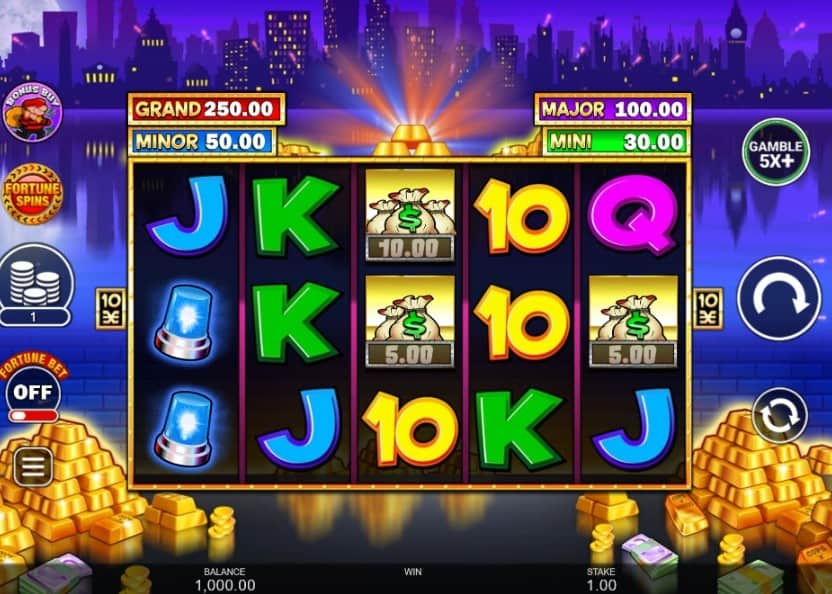 Visually, Cops ’n’ Robbers Grand Chance is as lively as its name suggests. The reels sit against a backdrop of a cartoon cityscape, complete with flashing police lights, open vaults, and getaway cars ready for action.