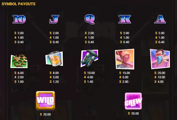 Let’s take a look at the cast of characters and items that populate the reels. The lower-paying symbols are your classic card ranks, from 10 to Ace, all given a cool neon makeover to fit the ‘80s theme. But the real stars of the show are the higher-paying symbols, which really bring the game’s criminal underworld to life. You’ll see knuckle dusters, a glass of booze, and a mysterious mechanical device. The highest-paying symbols are the crew themselves: the slick Roxie Rizz and the charismatic Diego el Fuego. Both Diego and the standard Wild symbol are the top payers, rewarding you with 10x your stake if you manage to land five of them in a winning combination. It’s these detailed and thematic symbols that truly make you feel like you’re part of the heist.